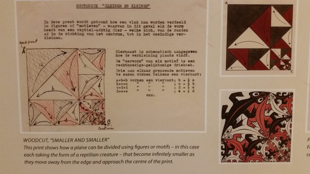 Het leuke is dat ik om de hoek woon van Escher in het Paleis, een museum dat volledig gewijd is aan het werk van M.C. Escher. Bijna zijn hele oeuvre hangt er en minstens één keer per jaar kan ik mezelf niet bedwingen en bezoek ik het museum. Telkens weer zie ik ‘nieuwe’ dingen, die mij eerder niet waren opgevallen.